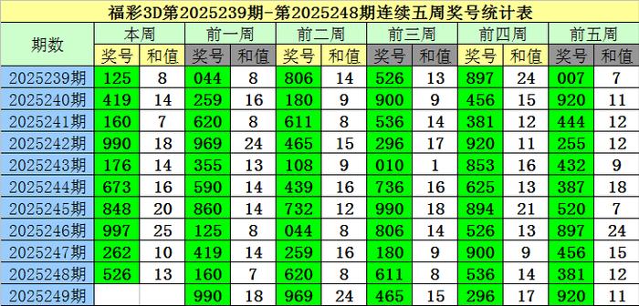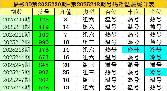 上期回顾:福彩3D第2025248期开奖奖号为:526,奖号类型为:组六,奖号冷温热态为:温号+温号+热号。